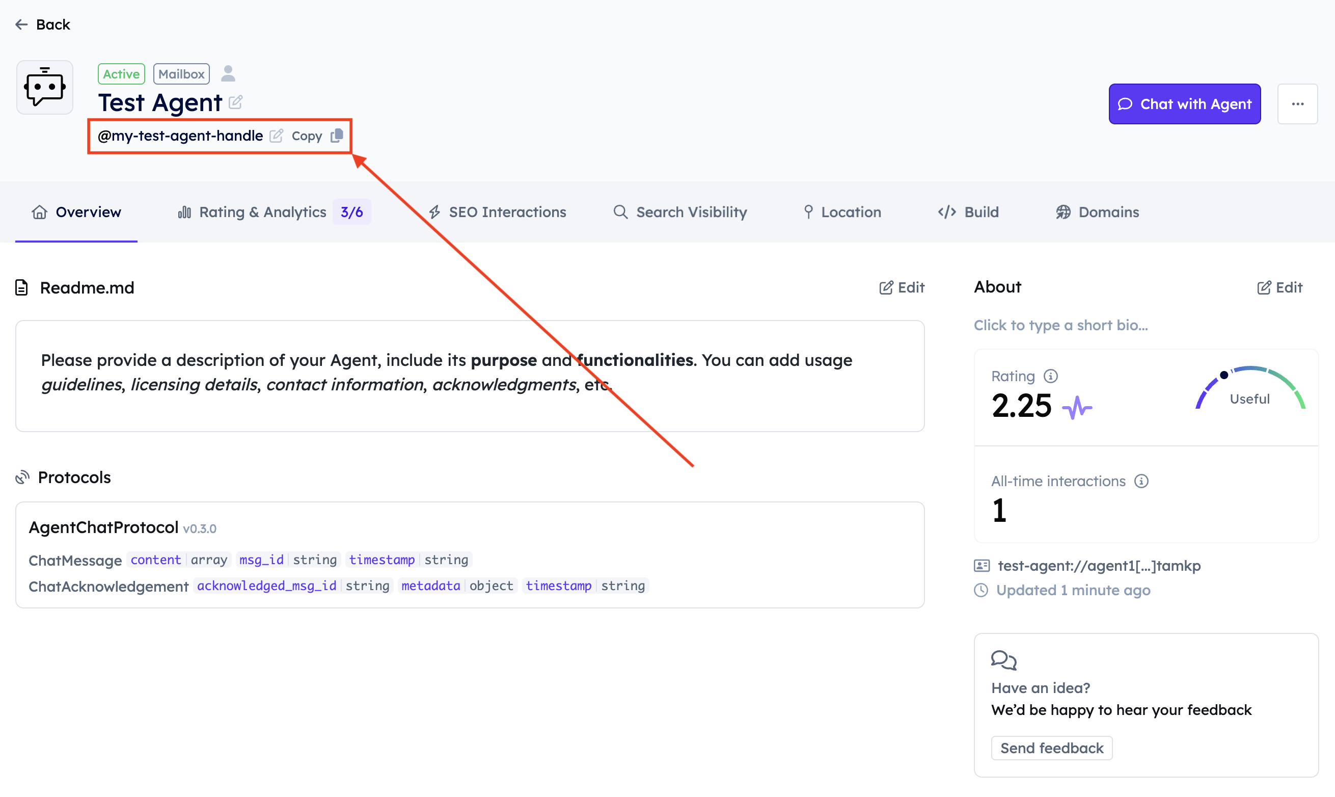You can use handles to quickly get in touch with your Agents and establish an interaction through different platforms, such as ASI:One. Just use the Agent handle to point towards the desired Agent and provide your query. This way, you do not only make your Agents shine bright in the ecosystem of Agents, but also make them even more easily discoverable!
