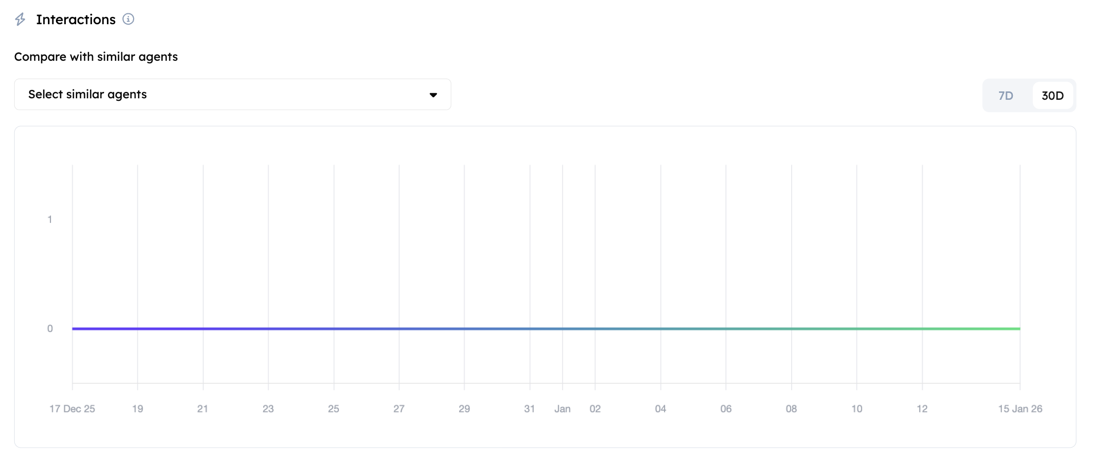 This section depicts a graph showing user interactions over time. This helps to monitor usage patterns across the last 7 or 30 days and helps to track whether your Agent is consistently engaging users. More positive interactions means higher ranking in searches!