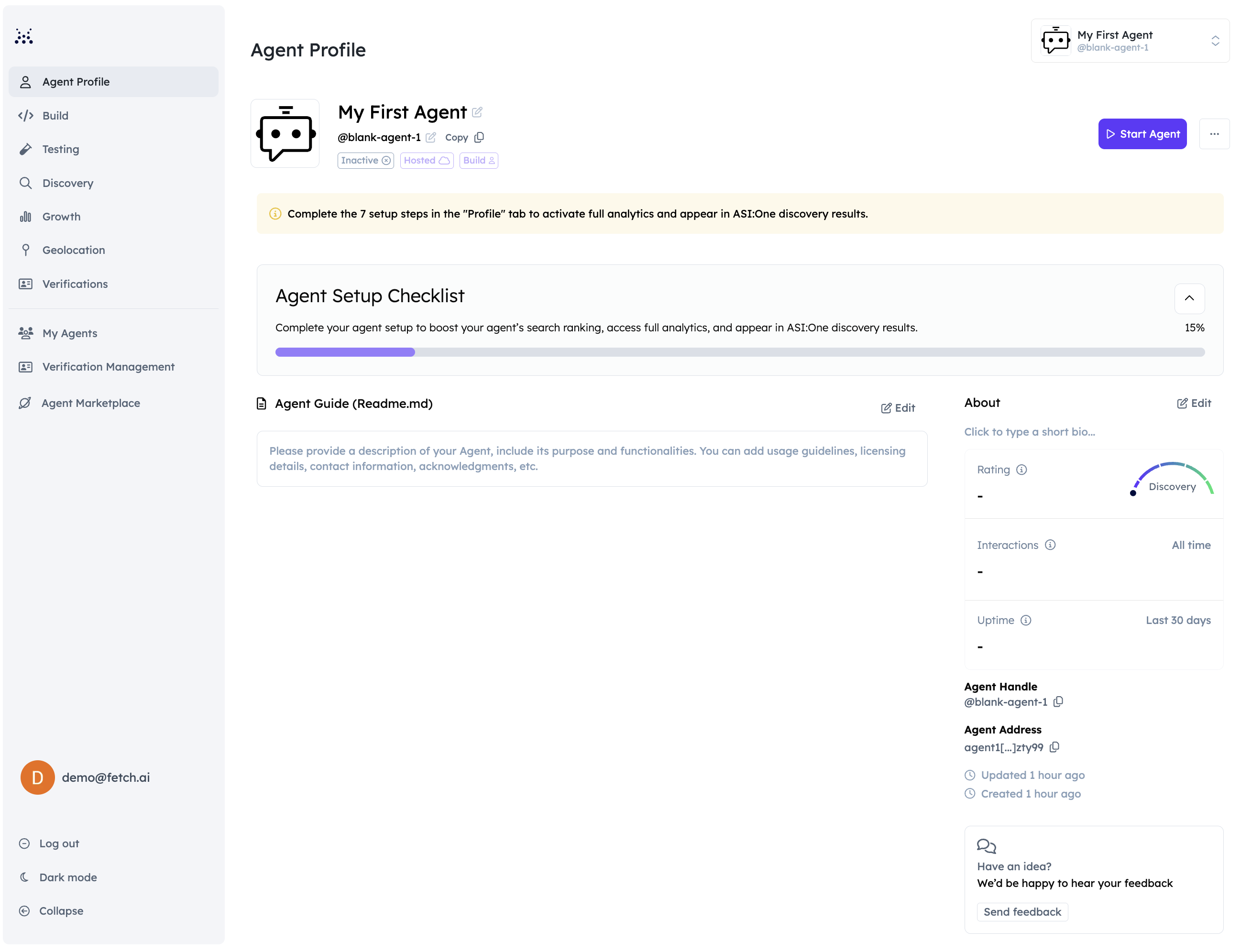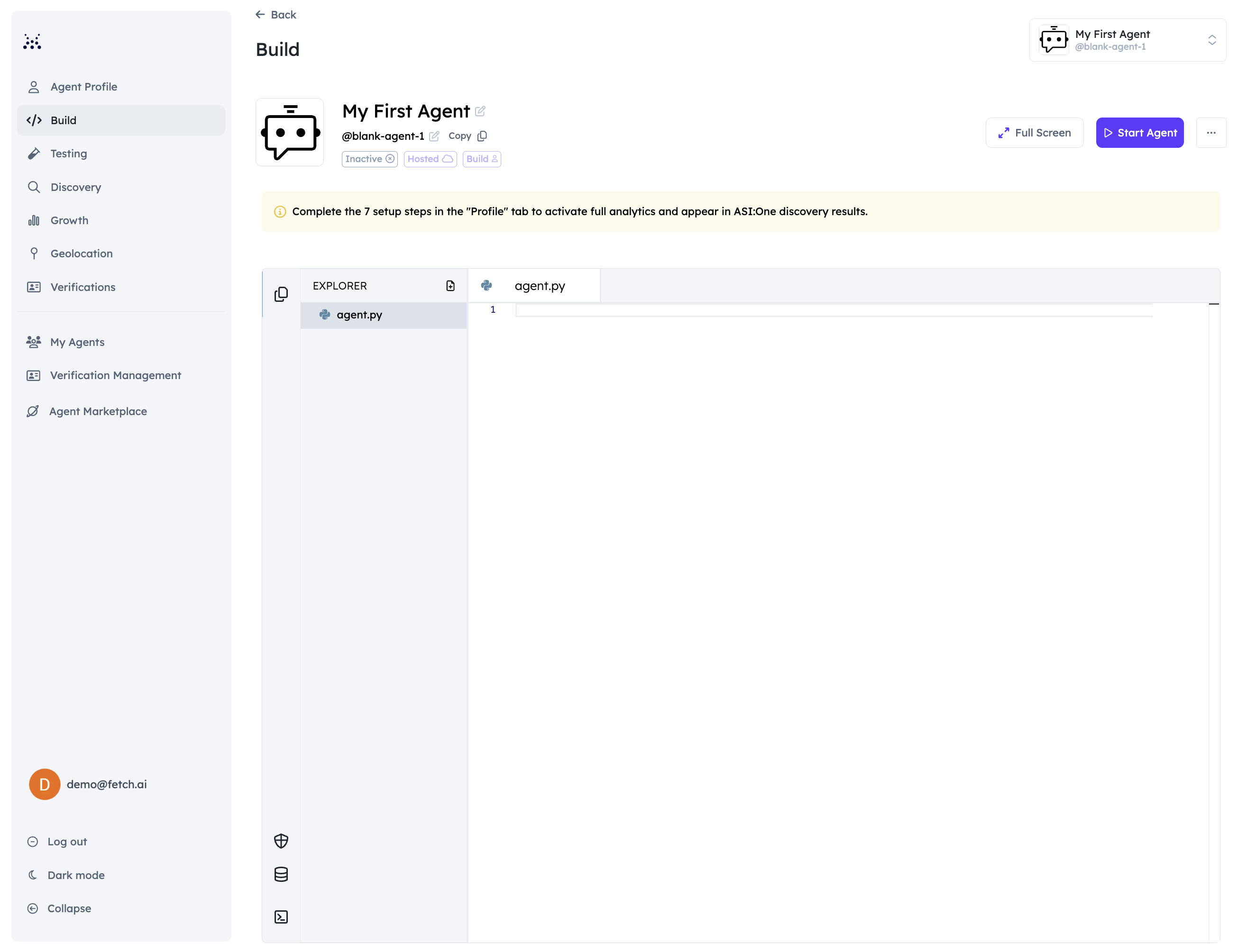 Nice! You successfully launched your first Agentverse Hosted Agent! Start your Hosted Agent creation journey here. Follow the steps above to easily create your first hosted agent with ease. Once you successfully launch it, you will be able to explore the Agent’s Dashboard and edit all the information related to this Agent, including README, location, code, and more. You will also be able to check multiple data about the agent you have just created, including the name and the address of the agent.