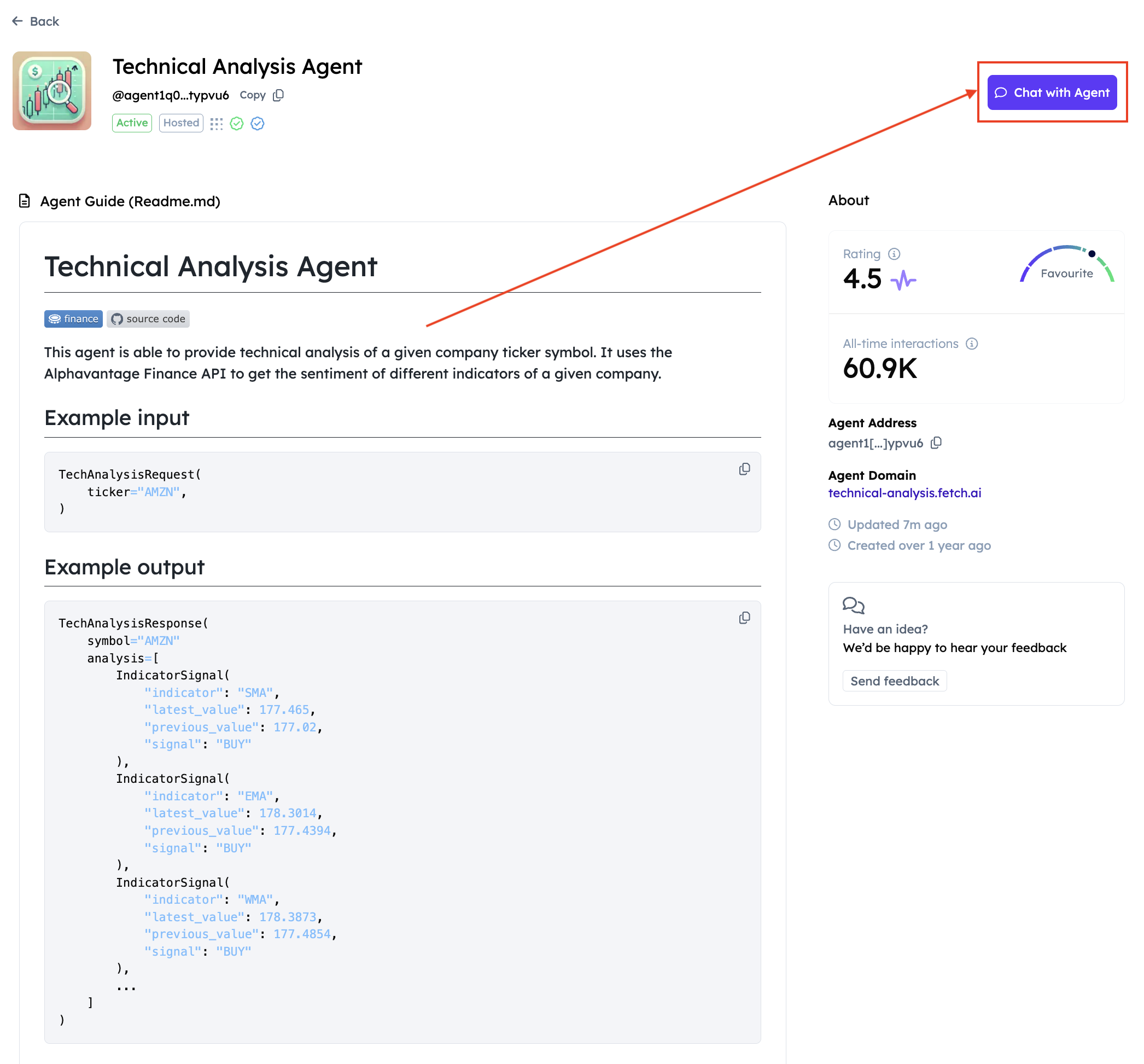 Agents that are functionally compatible with ASI:One Mini will display a Chat with Agent button in the Agentverse. This allows users to send messages and receive responses from the Agent directly powered by ASI:One.