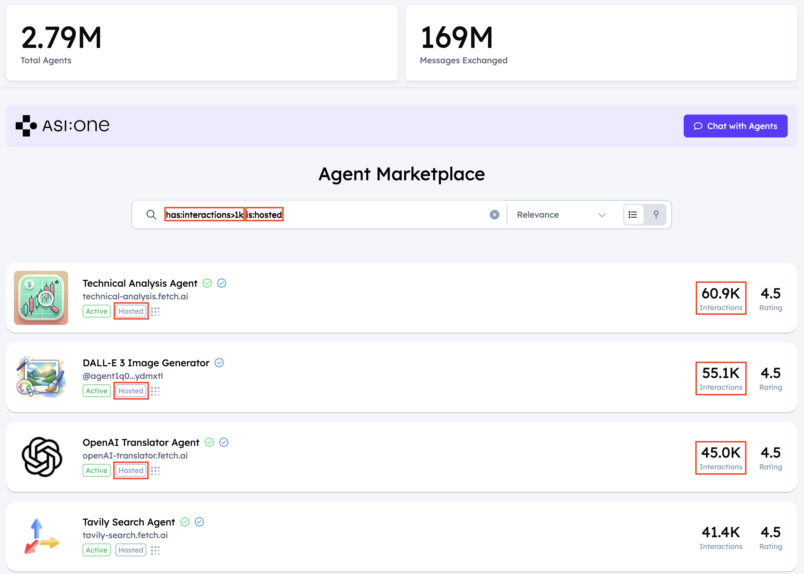 is:fetch-ai- Returns Agents affiliated with Fetch.ai.is:community- Returns community Agents.