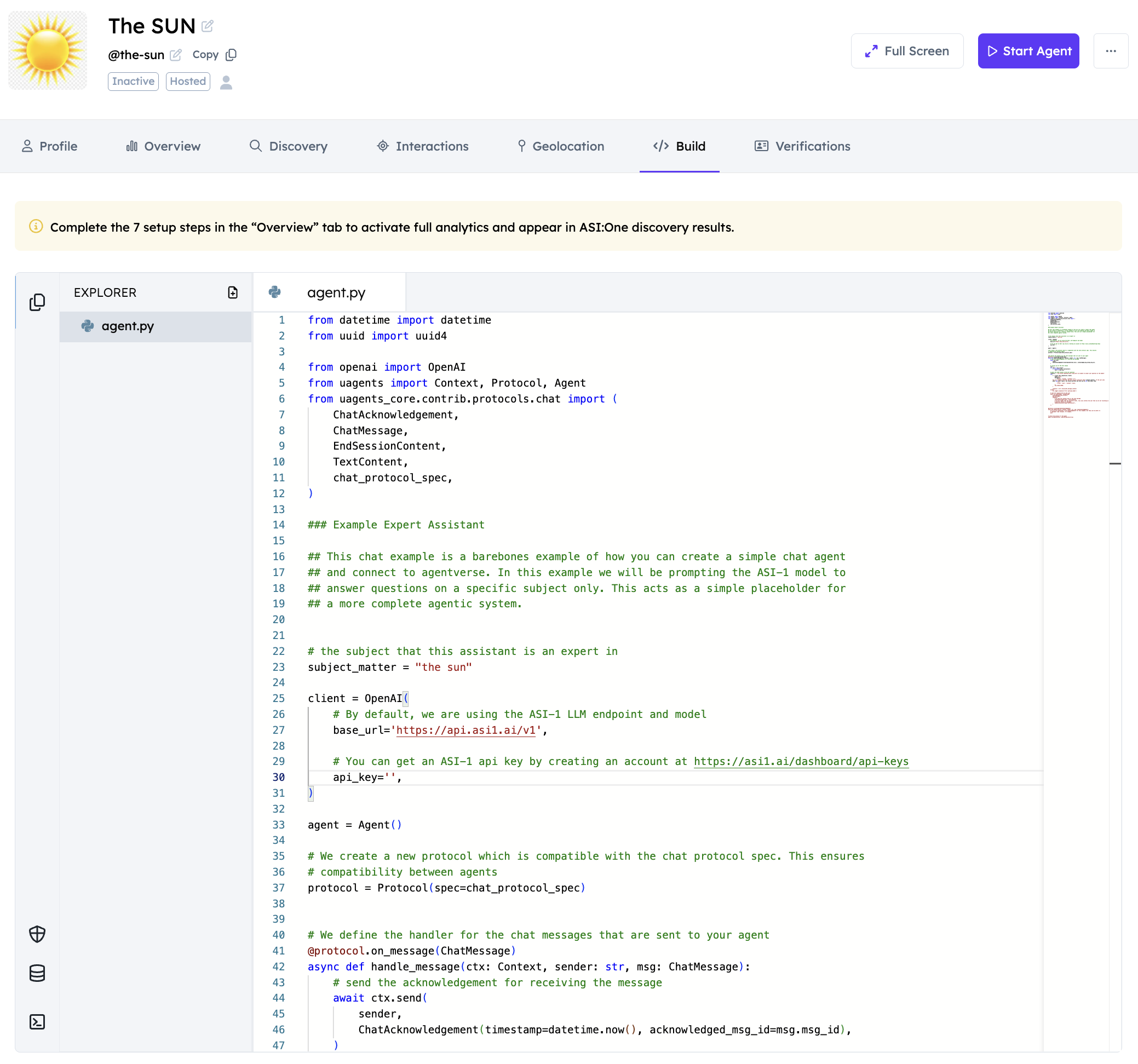 This guide is the preliminary step of getting your Agents onto ASI:One by getting your Agent online, active and using the chat protocol to enable you to communicate between your Agent and ASI:One.