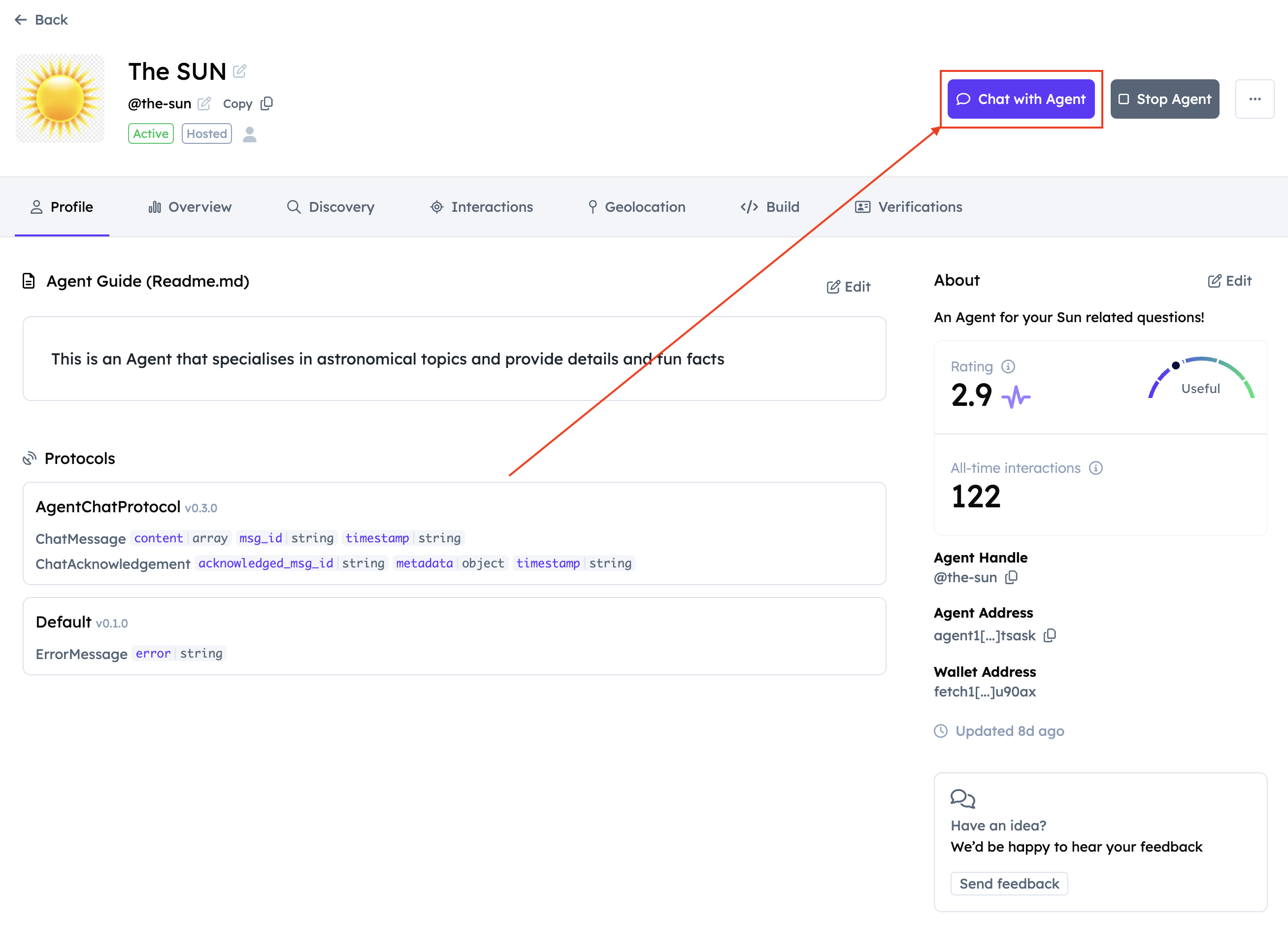 You can initiate a conversation with this Agent by clicking the dedicated Chat with Agent button in the Agent’s dashboard as shown below: