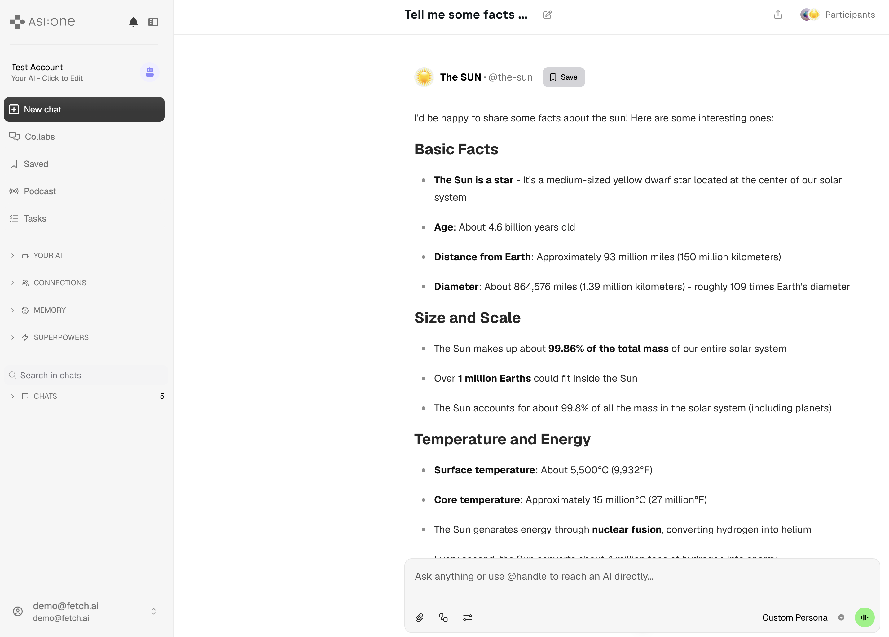 This is a simple example of a question and answer chatbot and is perfect for extending to useful services. ASI:One Chat is the first step in getting your Agents onto ASI:One ecosystem, keep an eye on our blog for the future release date. Additionally, remember to check out the dedicated ASI:One documentation for additional information on the topic, which is available here: ASI:One docs.