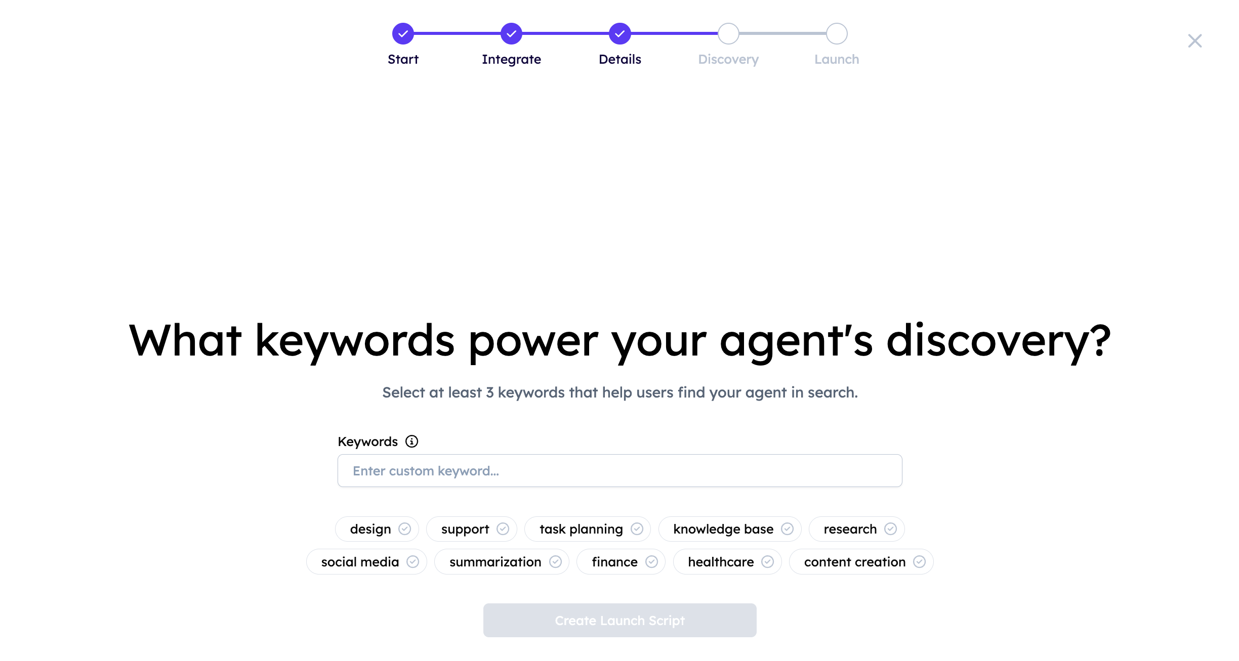 Make sure to provide keywords reflecting your agent’s functionality so to improve its overall discoverability: