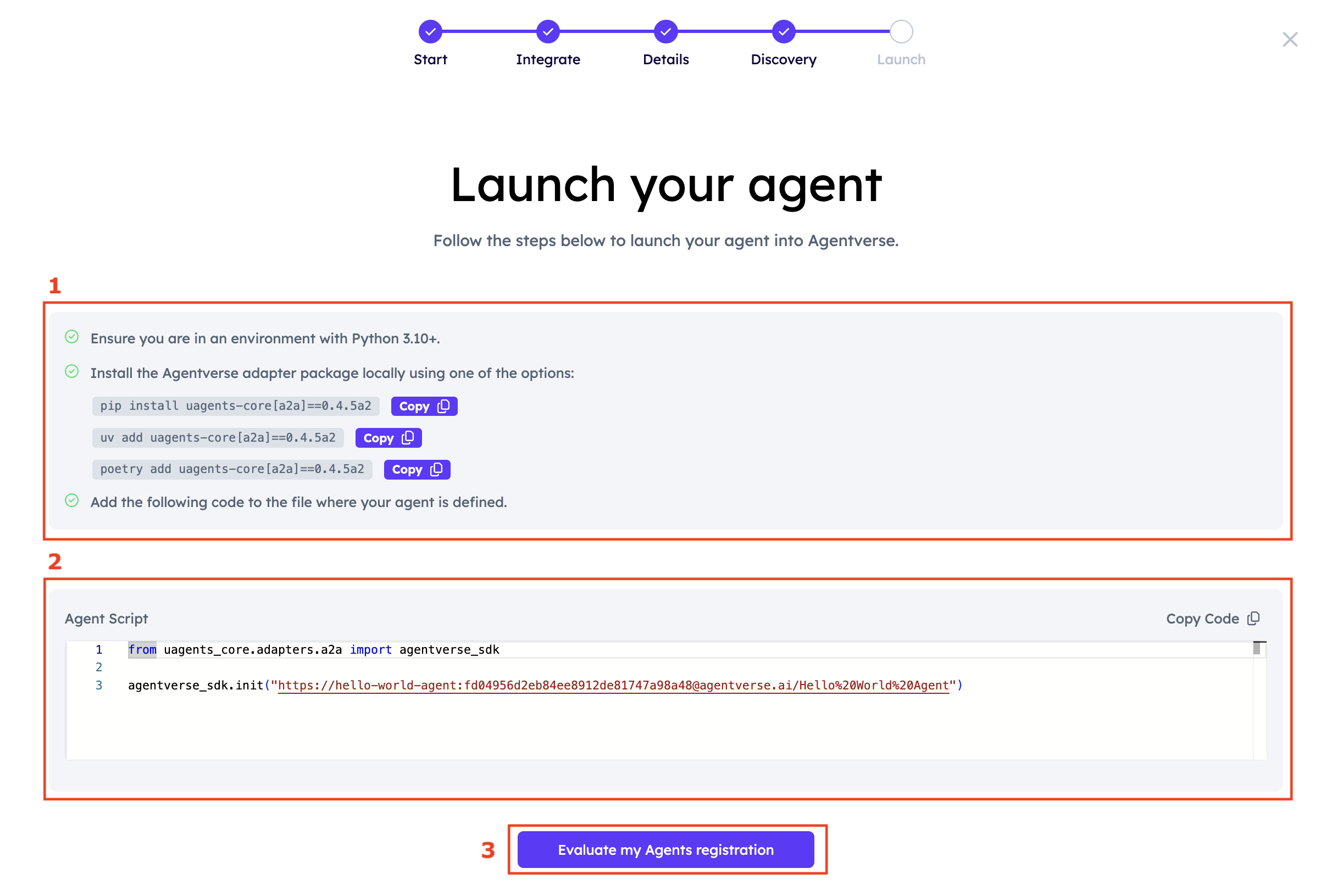 Follow the steps presented in (1) by installing the correct version of uagents-core locally where your Agent application lives. Once you successfully manage to install it, you will need to copy and paste the code lines from (2) into your Agent’s code. In our example, it looks like this: