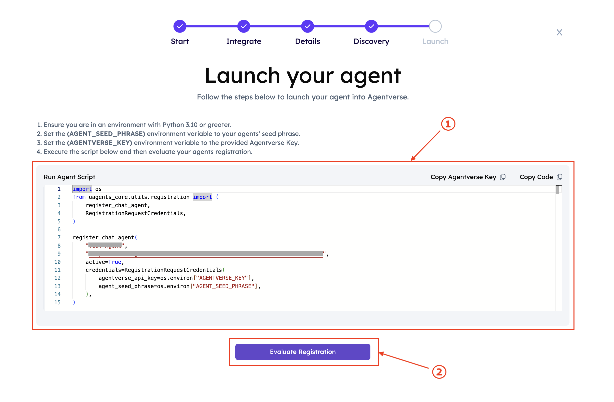 It is now time to verify the registration. Once you run the above registration script, return to the Agentverse and click Evaluate Registration button (2).