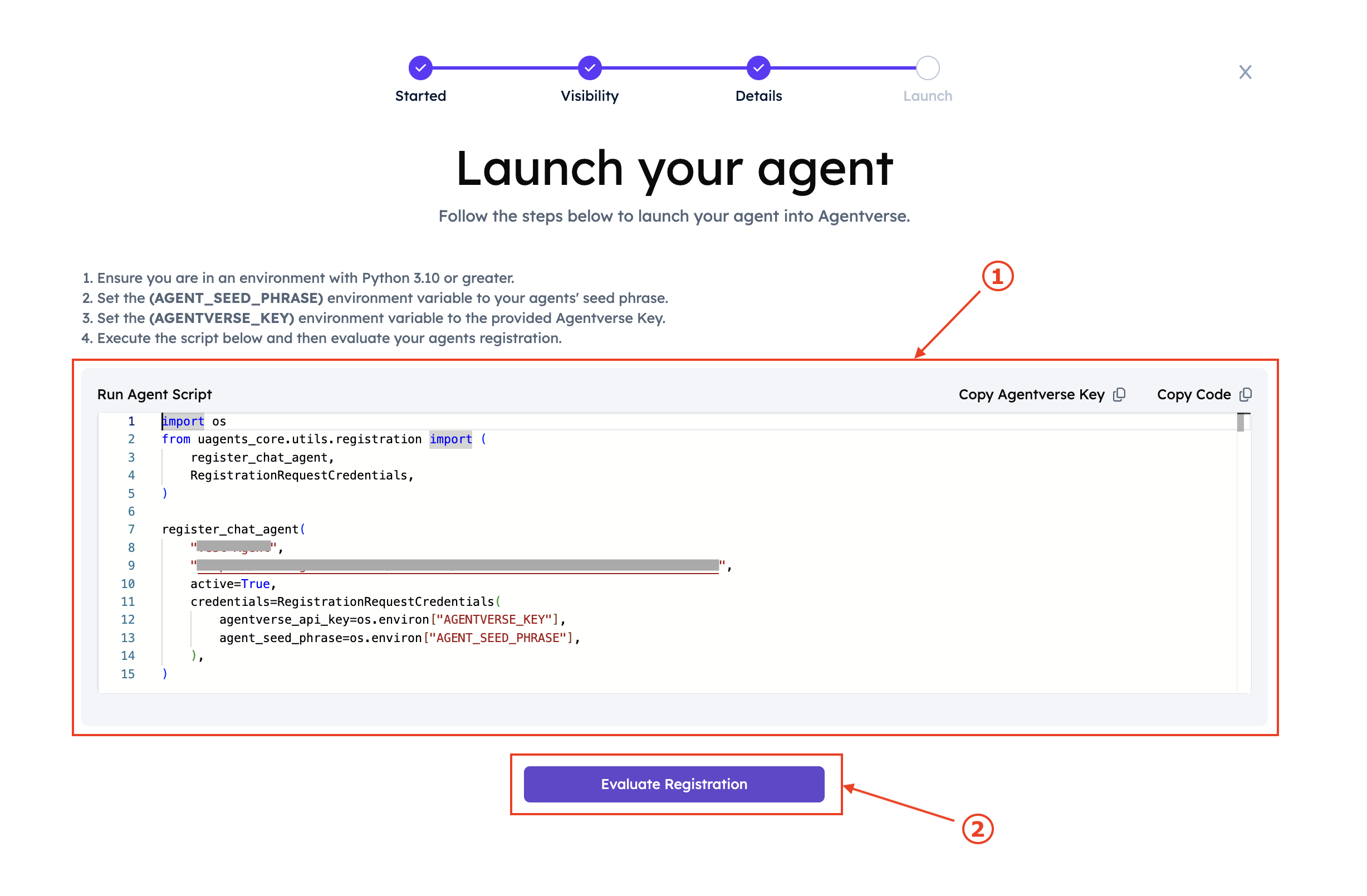 It is now time to verify the registration. Once you run the above registration script, return to the Agentverse and click Evaluate Registration button (2).