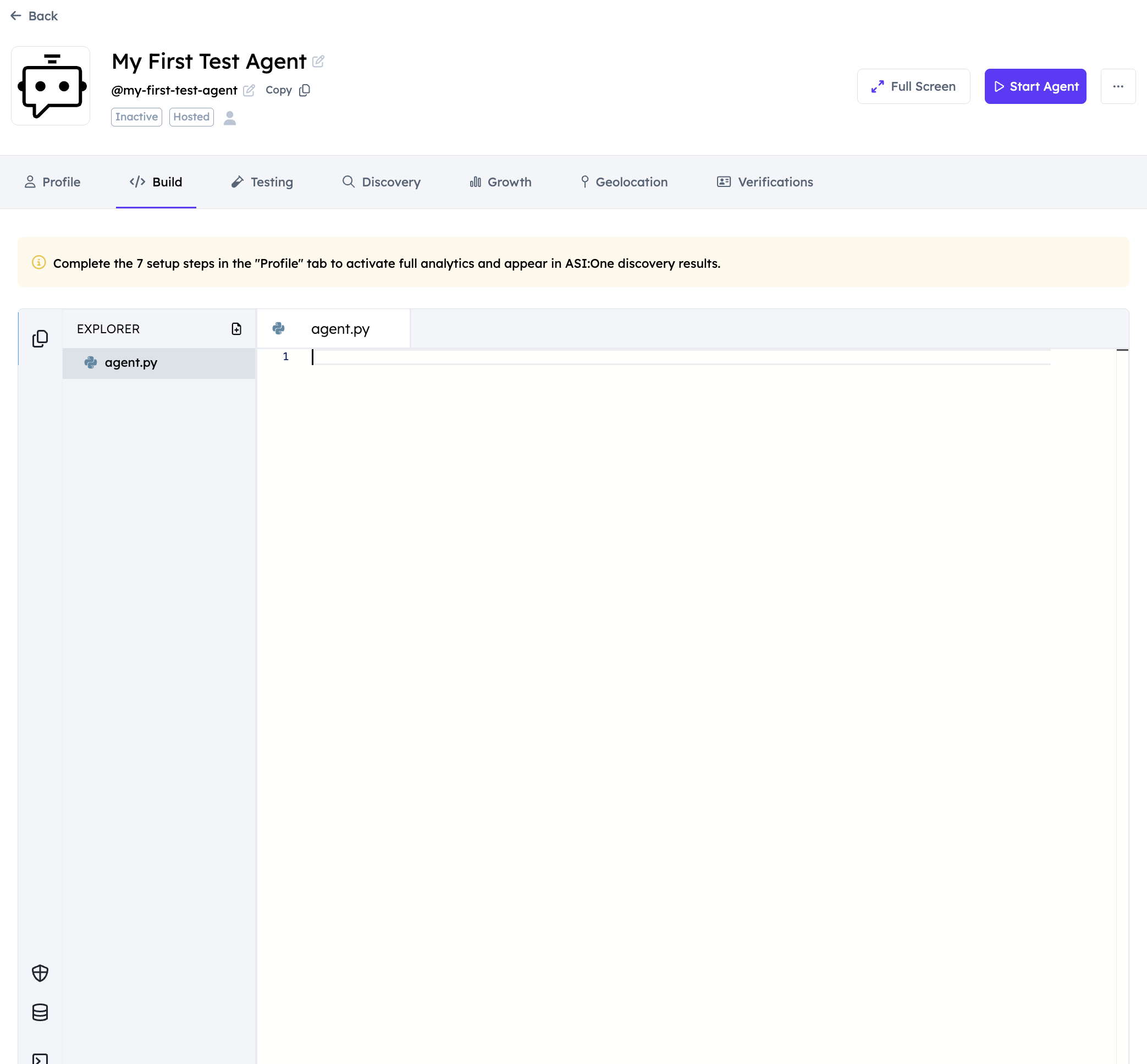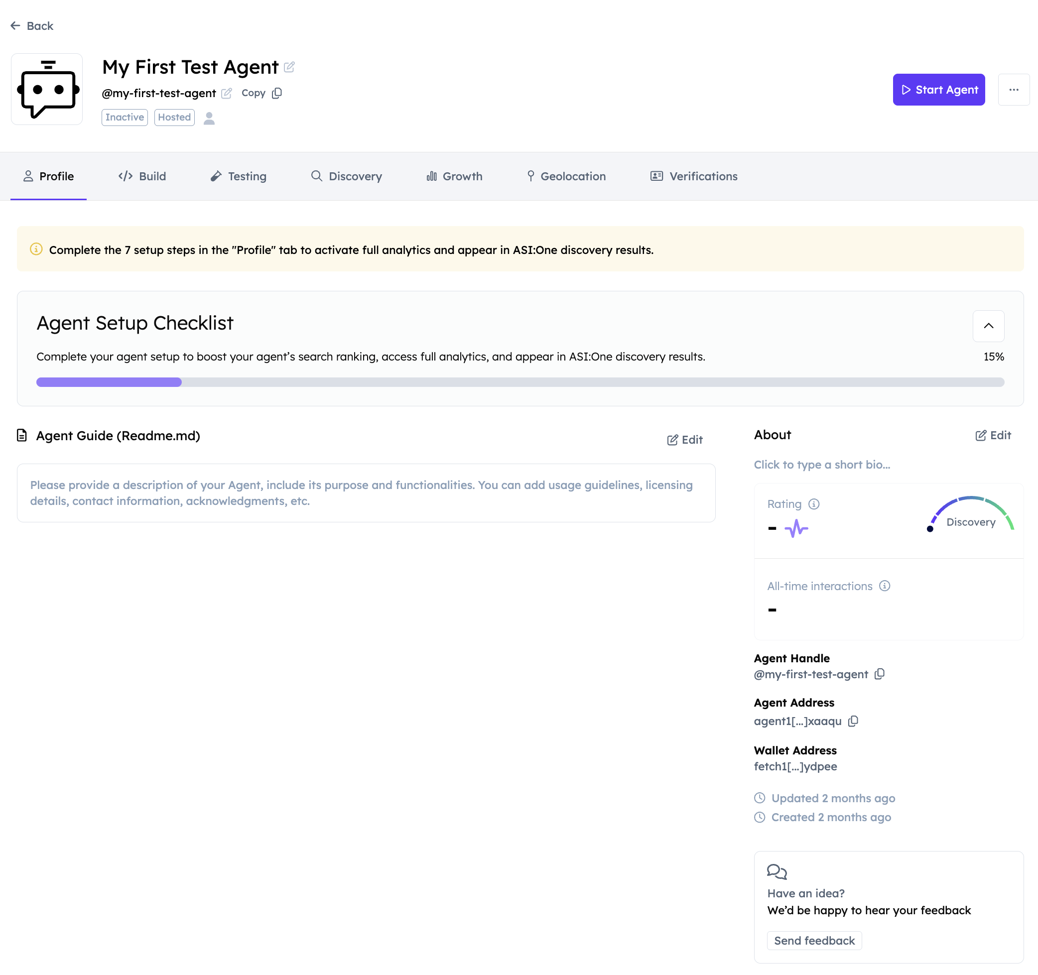 Nice! You successfully launched your first Agentverse Hosted Agent! Start your Hosted Agent creation journey here. Follow the steps above to easily create your first hosted agent with ease. Once you successfully launch it, you will be able to explore the Agent’s Dashboard and edit all the information related to this Agent, including README, location, code, and more. You will also be able to check multiple data about the agent you have just created, including the name and the address of the agent.